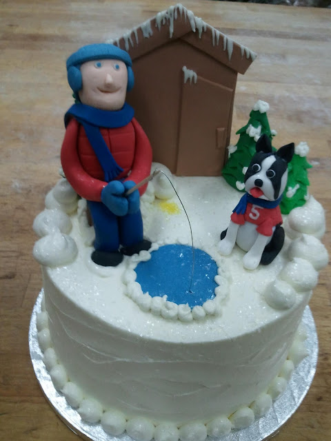 I also did a groom's cake for Meghan and Tim. Tim is from California, and had his first experience ice fishing in Minnesota last year. Meghan wanted to recreate this memory (complete with a story about him being fearful of peeing outside...notice the "yellow snow" behind him) and include their beloved Boston Terrier Mr. Figgins, in an Angel's sweater (it had a halo-ed "A" on the back).